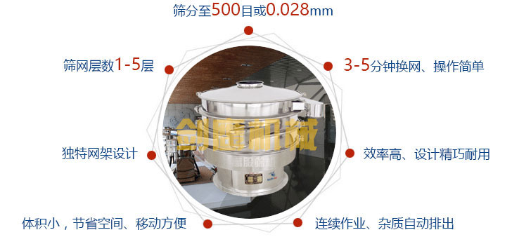 应用:针对粉状、颗粒状物料的筛选和分级,有独特的效果,广泛应用于食品、医药、化工、冶金等行业。 特点:任何颗粒、粉末、粘液一定范围内均可筛选。筛分最细至500目或0.028mm, 过滤最小可至5微米。分级筛选,可筛一至五层筛网,能同时进行二至六个等级的分选或过滤。效率高、设计精巧耐用,换网容易、操作简单、清洗方便。三元旋振筛杂质、粗料自动排出,可以连续作业。独特网架设计,筛网使用时间长久,换网快,只需3—5分钟。体积小,节省空间,移动方便。